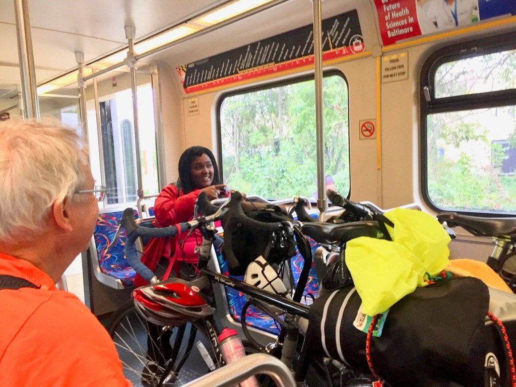We set out by bicycle the next morning. Putting our bicycles together and strapping all our gear on the back, we biked a few blocks west to a stop of the Baltimore Lightrail, for a fifteen mile train ride north. We could just wheel the bicycles on the train.