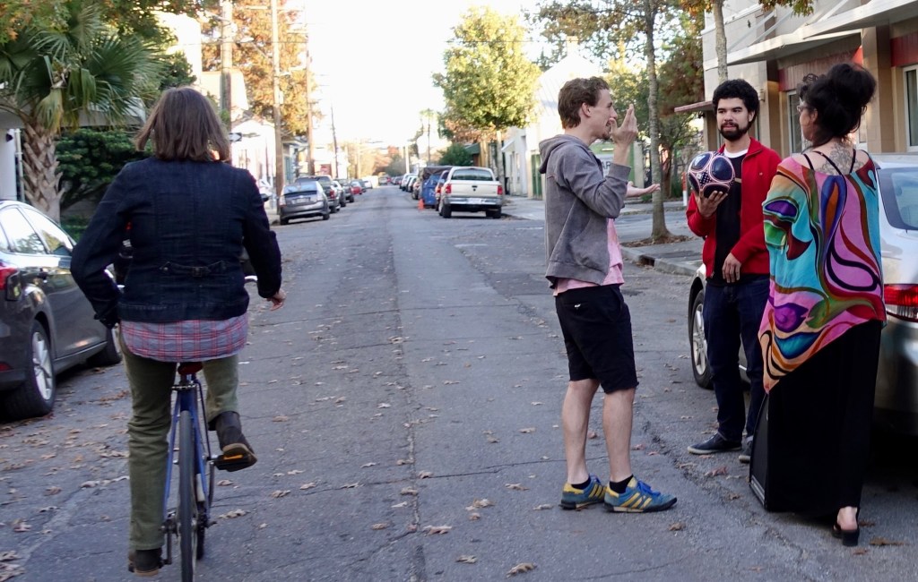 Part of the reason that the National Media might have chosen Bywater to be The Next Great Place is that young people (artists!) from all over the country have been moving here, so much so that real estate prices have zoomed up. I theorize the real artists are already moving to the next gentrifying area of New Orleans, wherever that is. New Orleans is big enough that for now there is always going to be a next-area-to-gentrify. For example, are these real artists or just young people or does it matter? What about the locals who are being priced out of their own neighborhood? There are a lot of out-of-state license plates along these streets.