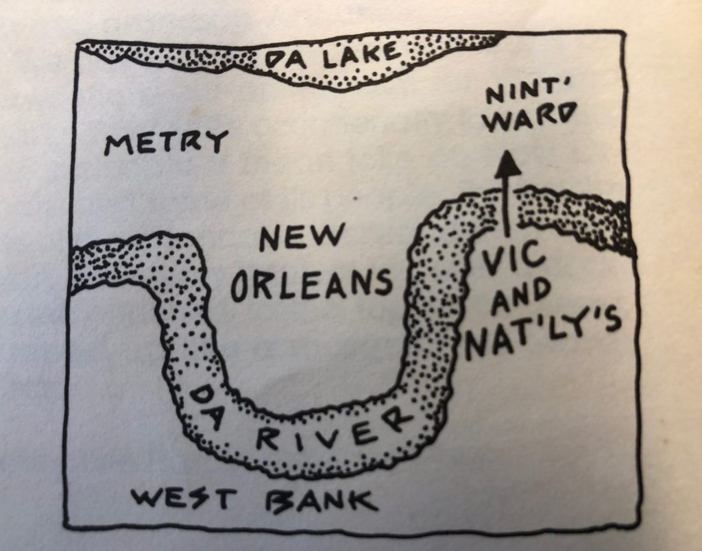 Bunny’s book even has a map. The Uptown short term rental we have currently been staying in is just above the letter E in “RIVER” in his drawing below. The French Quarter is just to the right of the letter S in the world “NEW ORLEANS.”