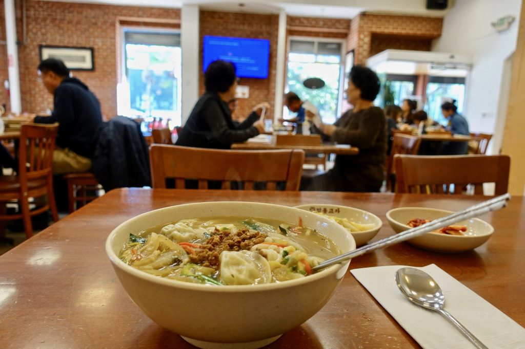 It was not yet lunch time but I was ready for lunch. Myoung Dong Kyo Ja was already half full at 10:55 AM. At $ 11.95 this was one of the cheaper entrees of this whole trip and probably the best meal. Their English translation menu listed this as “Korean chicken noodle soup.” It was a big bowl of flavorful broth and big slurpy noodles, dressed with several dumpling-like things and bunches of crunchy vegetables and kimchee.