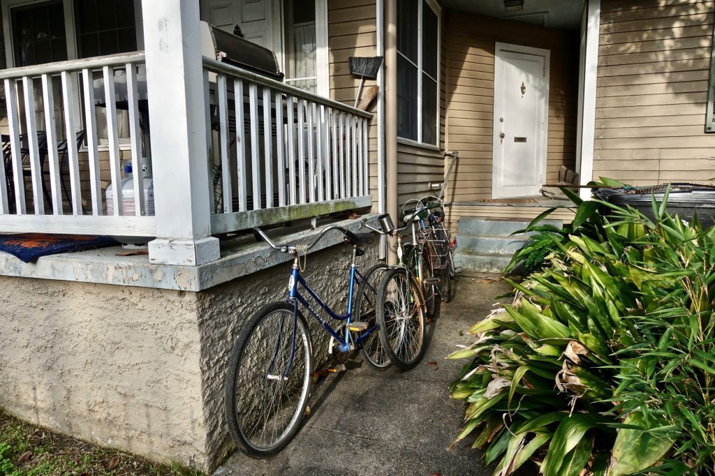 Kirk allows us to store bicycles in the crawl space under her house. We took them out on our arrival and kept them in her side yard. We rode frequently around the city. In addition to Tootie’s blue Schwinn, I have two bicycles there now, my Schwinn Typhoon for city use, and an older ten speed for longer trips