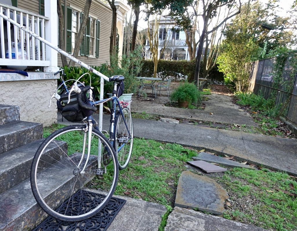 Early one Sunday morning I took a day long bike ride on my Lambert framed ten-speed. I bought this bicycle used in Virginia Beach in the fall of 1974 but have replaced every part of it except the frame, which itself has been repainted more than once. I would hate to throw the bicycle away so it stays stuffed underneath this house in New Orleans.