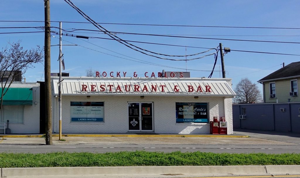 New Orleans had a big influx of Italian immigrants in the first part of the twentieth century. Rocky and Carlo’s (“Ladies Invited”) was closed when I passed it at 9:30 AM. New Orleans proper used to be full of reasonably priced Italian-American-Creole restaurants, where one could get an oyster poor boy but also spaghetti and meatballs. These places are now mostly in the suburbs. At Rocky and Carlo’s their speciality is macaroni and cheese.