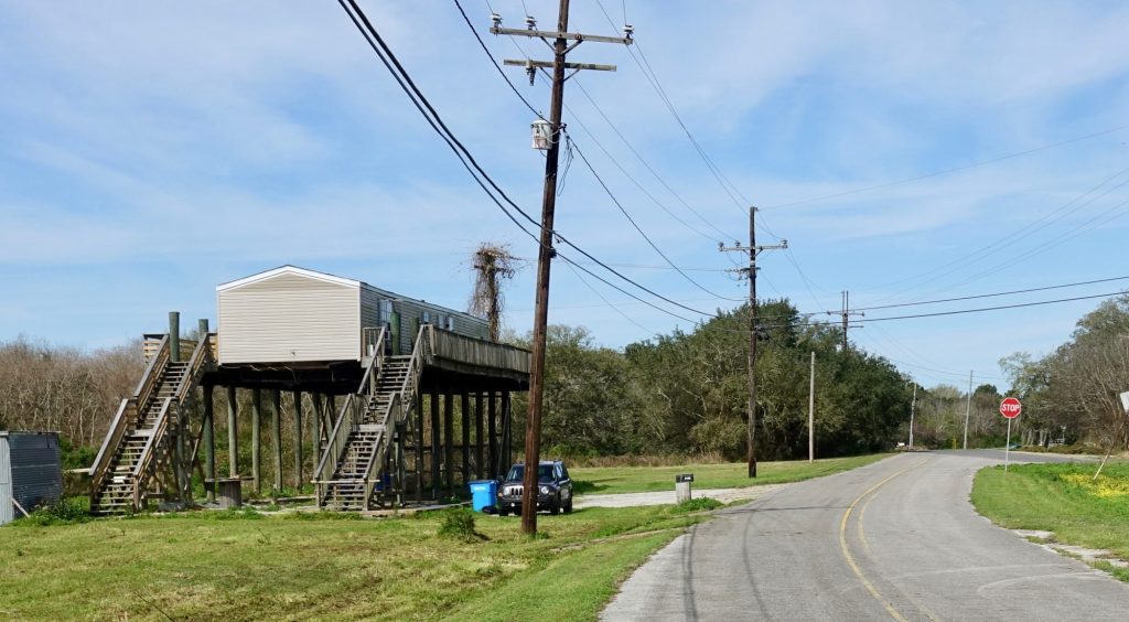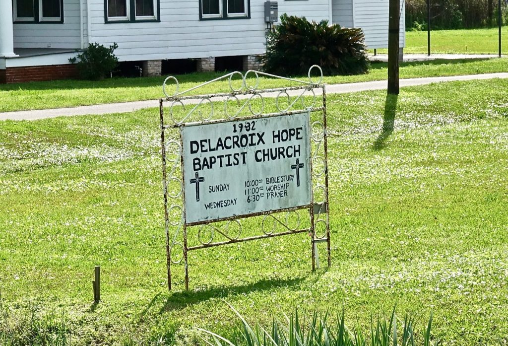 While the map labeled certain areas as “towns,” human settlement pretty much just lined the two lane road, which followed along a bayou. Counterintuitively, the highest ground here is along the bayous, next to the water. This sign below was encouraging, even though I had not yet arrived at the area that the map called Delacroix.