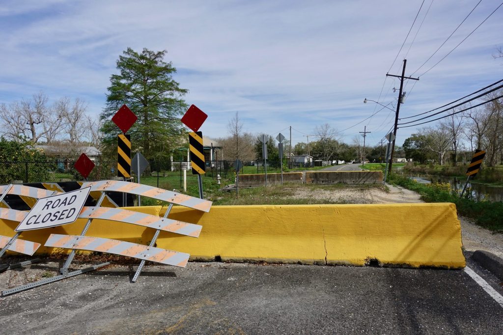 Past the town of Poydras there is a newer highway. The old road, running parallel about a quarter mile south of the new highway, is refreshingly free of traffic and perfect for bicycling. The Parish used a blunt instrument in keeping cars from using the old road as a throughway. I easily walked the bicycle around the barriers.