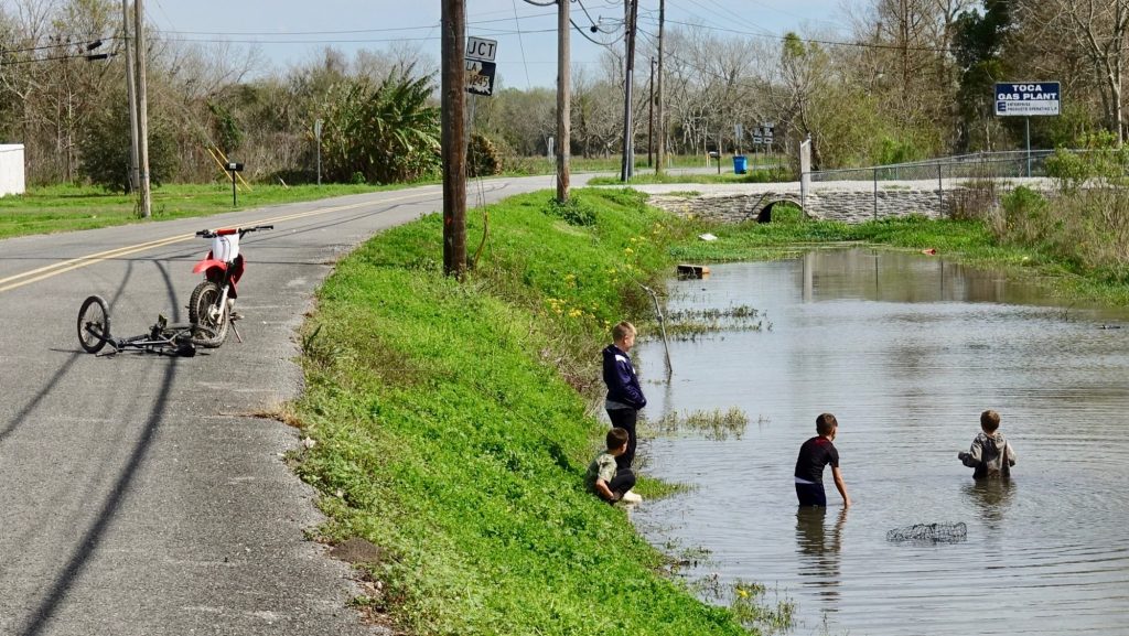 Even this far south, the winter is still, well, the winter. The temperatures were in the mid to low sixties. This did not seem to stop these kids from swimming in the bayou.