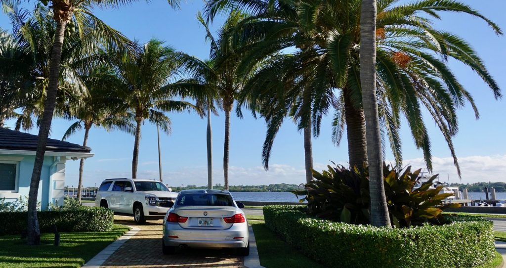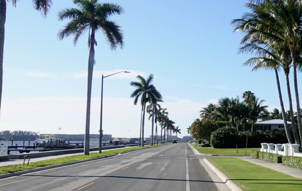 I bicycled south along the western shore of the bay, across the water from Palm Beach proper. Even on this side of the bay the scene was ritzy, including having this Ferrari parked outside someone’s house.