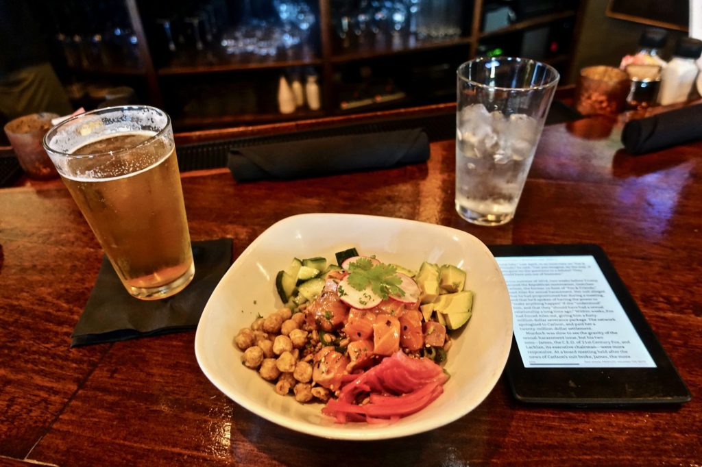 A year ago I had had a memorable alternative take on salade Nicoise at a restaurant in downtown Fort Lauderdale called Foxy Brown. I excitedly got there this day about 2:30 PM but the server said that they had taken that item off the menu just last week! Still, a poke bowl with raw salmon, avocado, pickled onions, garbanzos over faro was quite good.