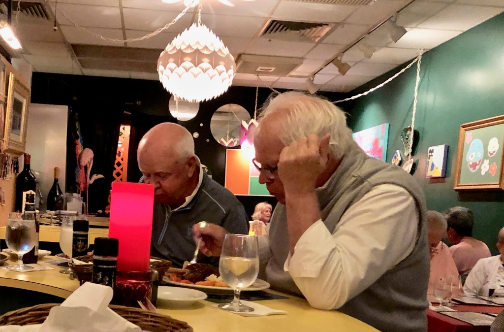 With only a bicycle I was somewhat remote from restaurants. I have a new lighting system and was comfortable biking a short distance in the dark. About a mile or two away over residential streets were a few restaurants, including the Rhythm Cafe. Built out of an old drugstore almost thirty years ago it seems to be a place where the upper crust of Palm Beach can go slumming. With $ 25.00 entrees it certainly was not cheap. My very helpful and friendly bartender (an ex-lawyer now working mostly on LGBQT issues) told me that people have to get reservations there weeks in advance during prime March dates. I luckily got a seat at the bar. In contrast to Miami where things look multicultural to the extreme, here it looked like a Midwest well to do country club or retirement home. The guy to the left in the picture below asked for a glass of milk halfway through his meal.