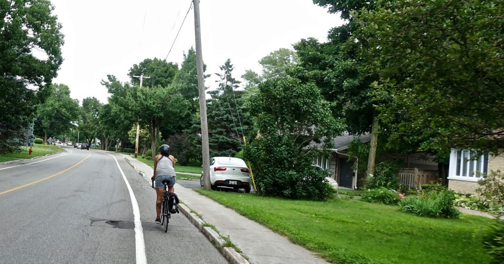 Bicycling further into the city it still looked like the average American neighborhood, even though it was not. (We are in French speaking Quebec, right?) We tried to keep up with this young woman as we all followed La Route Verte signs.