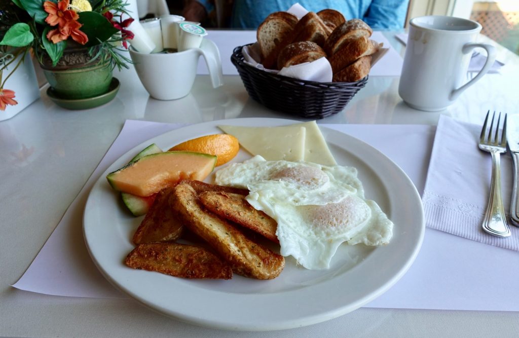 Maybe it is just me, but in America a menu might offer “two eggs any style with toast, hash browns and choice of bacon or sausage.” Here they say the same, in French, except that they say “bacon, sausage or cheese.” Cheese? So I got cheese. This is a low cost restaurant but unlike America plastic utensils are nowhere to be seen and the bread is fresh.
