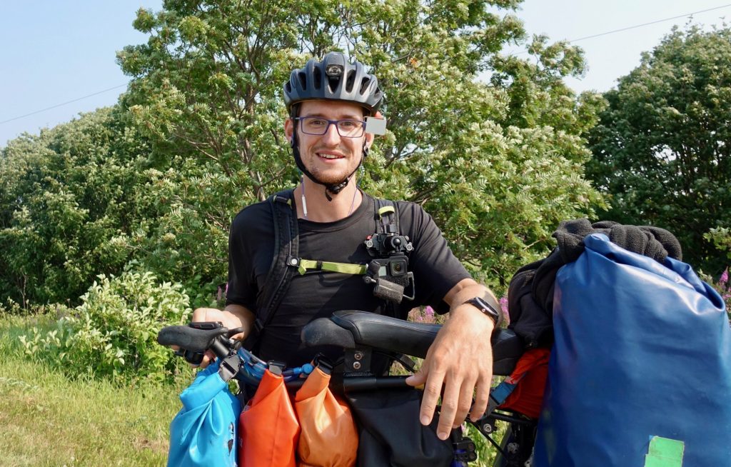 A few miles outside of Riviere du Loup we met a guy on the highway who on Instagram goes by the name Unicycle_Dave. He lives in Toronto and had started unicycling 2000 miles west in British Columbia. His custom made unicycle has a 36 inch wheel and a two speed gearbox. It is a fixie, he cannot coast, he has to always keep pedaling. He had been on the road 49 days and wants to go all the way across Canada to St. Johns, Newfoundland. He regular job is in video production and despite the fact that he had little room to carry anything, he had all sorts of complicated photography equipment, including a video drone, which he said he used occasionally. He wants to make a documentary movie about his journey. With his I-phone Lyman filmed me riding with him down a hill, as well as a still shot of the two of us.