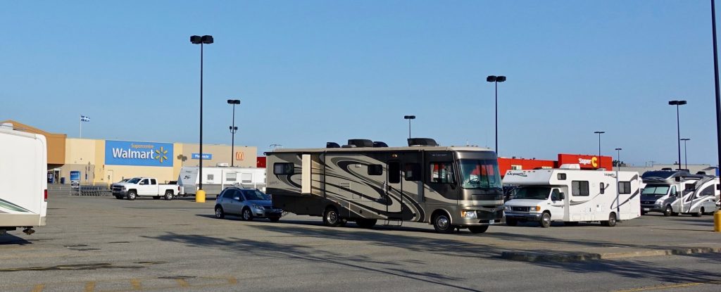 The next morning at 7:00 AM I bicycled by myself through Rimouski to Enterprise Car Rental in the suburbs, right next to the Walmart. Even in Canada the Walmart is safe harbor. Just like in the USA people know that Walmart does not mind you parking there. There were about forty camping vehicles that had stayed overnight in the Walmart lot.