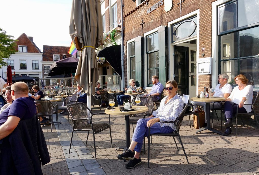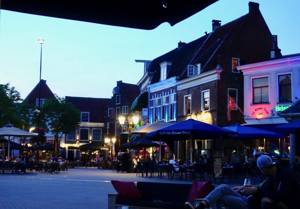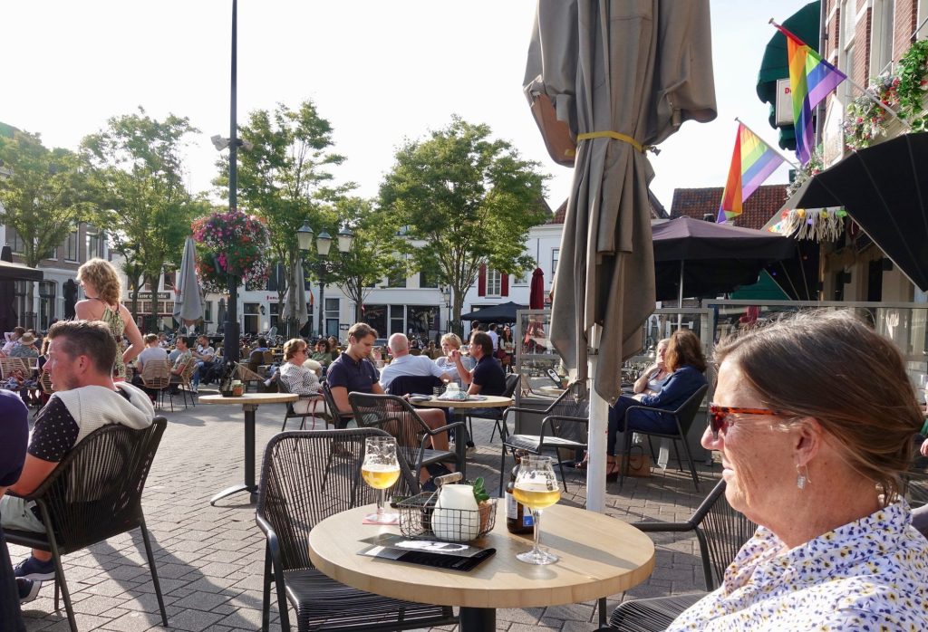 We were able to wheel the bicycles onto the train. We had chosen the medium sized city of Zwolle as a starting point on our bike ride, but less than an hour into the train ride the otherwise perfect Dutch rail system had some kind of problem. We were stopped at the train station of the also medium sized city of Amersfoort, forty miles southeast of Amsterdam. Why Zwolle anyway, we thought? Let’s just start our trip in Amersfoort, a place neither of us previously knew anything about. Rather than sit on a stopped train waiting for something to happen, we just got off the train and started bicycling through the city. We bicycled up to a central square where people were sitting around enjoying the late afternoon. I imagine the long dreary winters here encourage people to sit in the sun while it is available. We got beers.