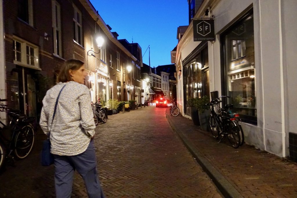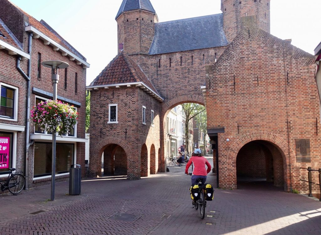 The first day out we wanted to go all the way to the supposedly scenic city of Kampen, almost sixty miles north. This was to be our longest cycling day. Leaving central Amersfoort we passed through a city gate. Tootie uses yellow and black Ortlieb panniers on the back of her bike.