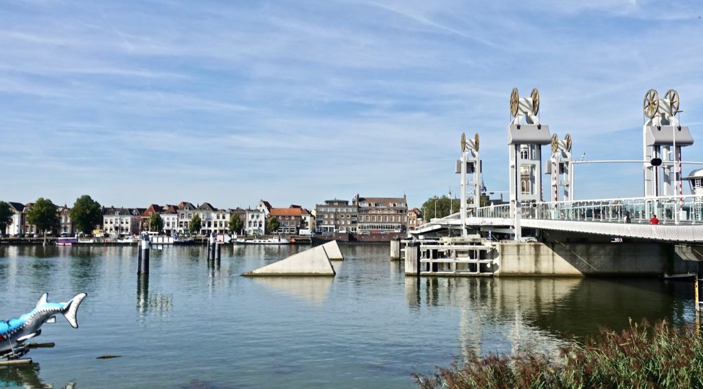 The next morning we biked north out of town. Bicycle traffic was stopped at the red light crossing the bridge. The other side, we looked back at Kampen from across the river.