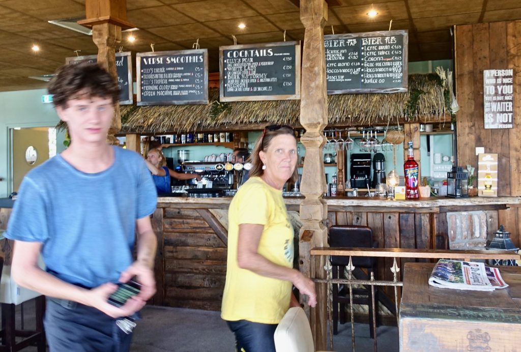 She felt a little better later on when we bicycled a quarter mile down the road for early evening drinks at Elly’s Beach en Bistro, with its Caribbean / Hawaiian themes. Little kids were playing in the sand but we had been bicycling outside all day in the sun. We sat inside at the bar.