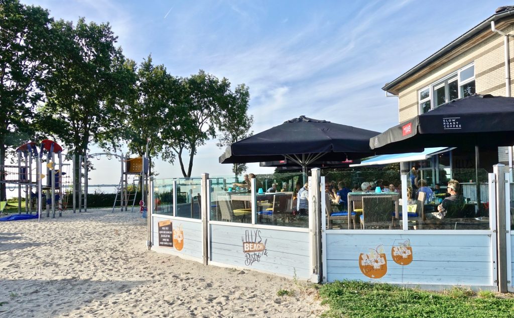 Refreshed, we went back to our trailer and chilled before walking to a restaurant at another campground across the road. What American campground would boast of the quality of its semi-fancy restaurant? This was likely the best meal we had in the Netherlands. We ate outside to watch the sun go down over the water. I got steamed mussels as an entree.