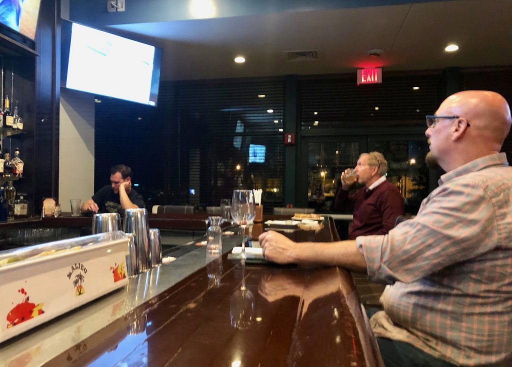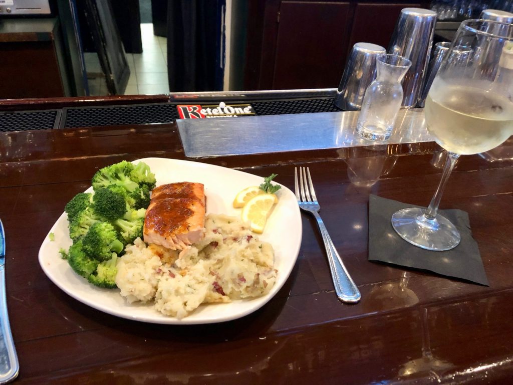 In a college town there are usually lots of places to eat; not so much here. The hotel restaurant seemed the best place to eat. I sat at the bar. The menu was very old school: choice of meat with two sides. I got salmon with mashed potatoes and broccoli. It was quite delicious. There were five or six mostly older men eating alone at the bar, sitting one or two seats apart. None of us talked to each other, which did not really bother me. We did all talk to the bartender. She said she was from Philadelphia.