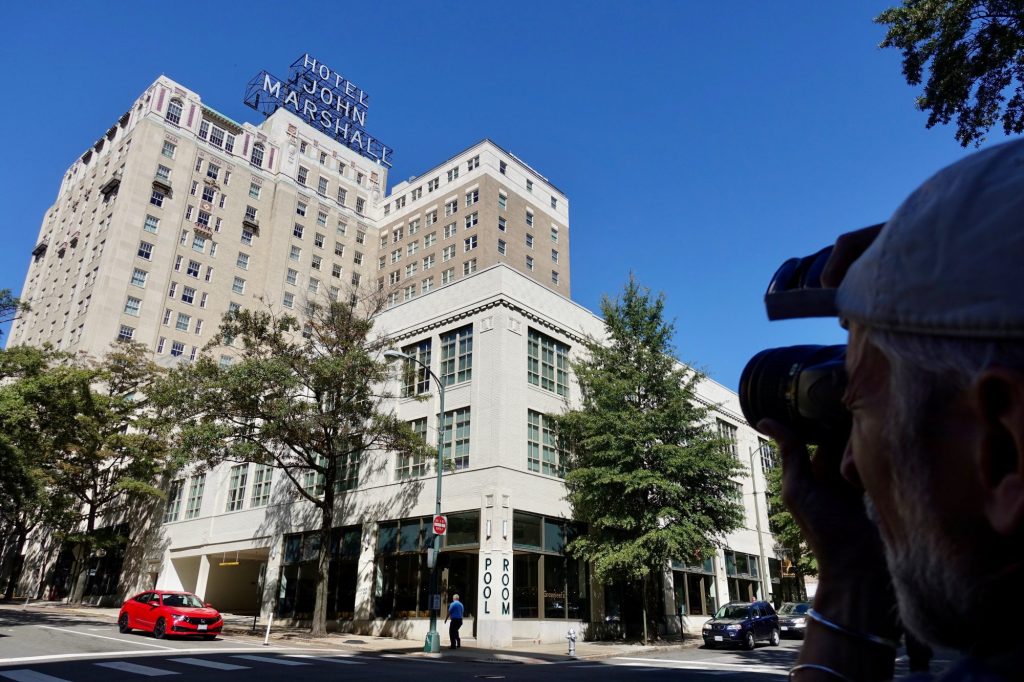 This is John photographing my namesake, built in 1929. I am not related to the famous Chief Justice. Although the owners kept the famous sign, it is now apartments, not a hotel.