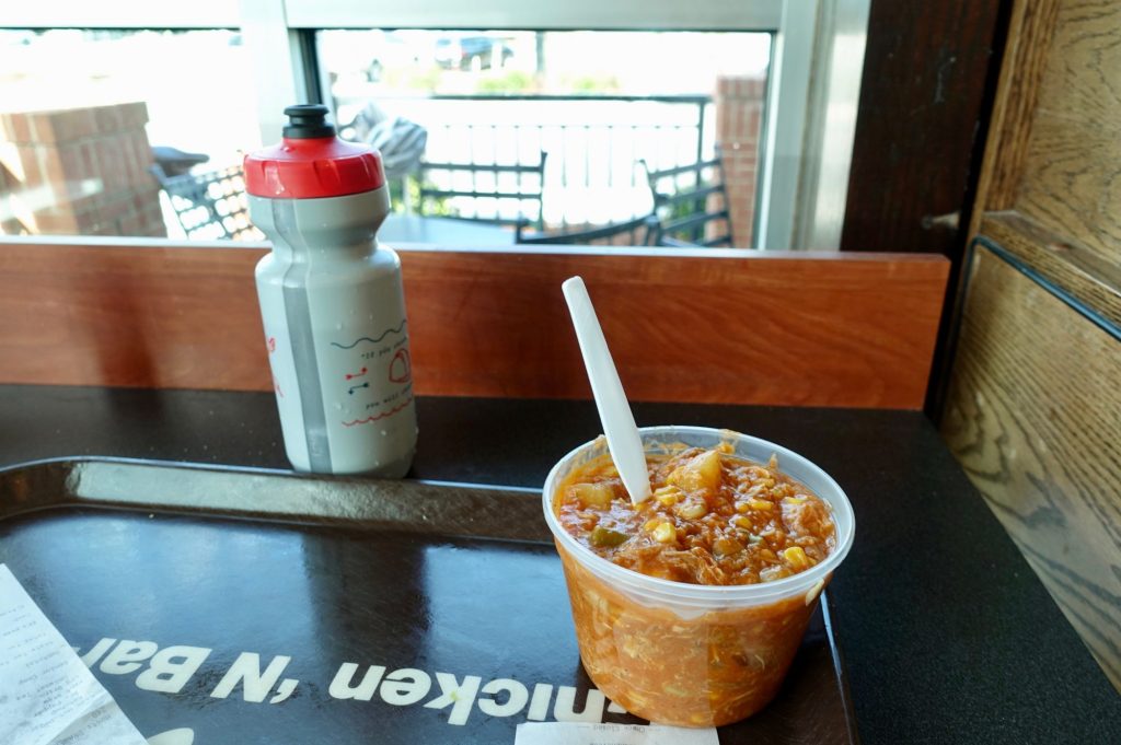 What to eat? My doctor has suggested I cut down on animal fat and red meat. Brunswick stew was the healthiest looking thing I saw; only by the pint: $ 5.99. The young woman at the counter offered their special of a second pint for only $ 2.00 additional. (No wonder Americans are fat!) I declined, what would I do with another pint of Brunswick stew? I brought my own beverage (my water bottle!)