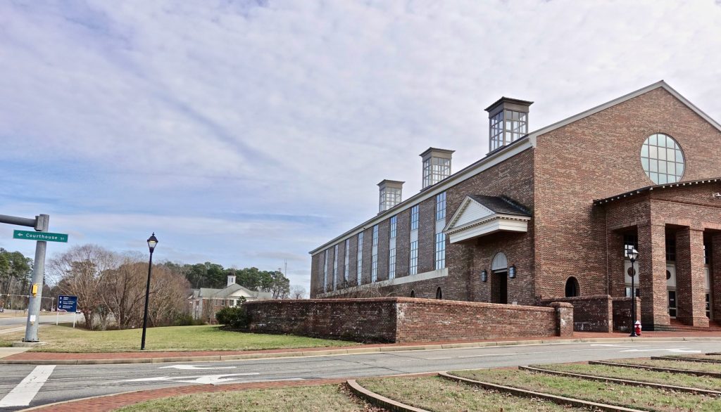 Bicycling into metro Williamsburg from the west on Monticello Avenue, there were miles of newer commercial sprawl, Food Lions and Old Navys. One normally would expect a courthouse to be in the downtown center. Not here. Mixed right into the strip malls was Williamsburg’s new courthouse; one of the strangest looking municipal buildings I have seen in a while; putting the “colonial” touch on courthouse utility.