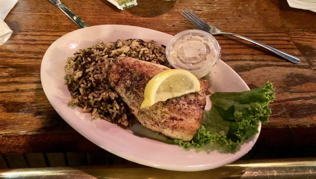 Rockfish is common around the Norfolk area but I had not known of it until my sister Jane introduced me a couple of years ago. Here they allowed for half orders and I got it broiled, with a side of rice. I came with a plastic thing of tarter sauce (old school!)