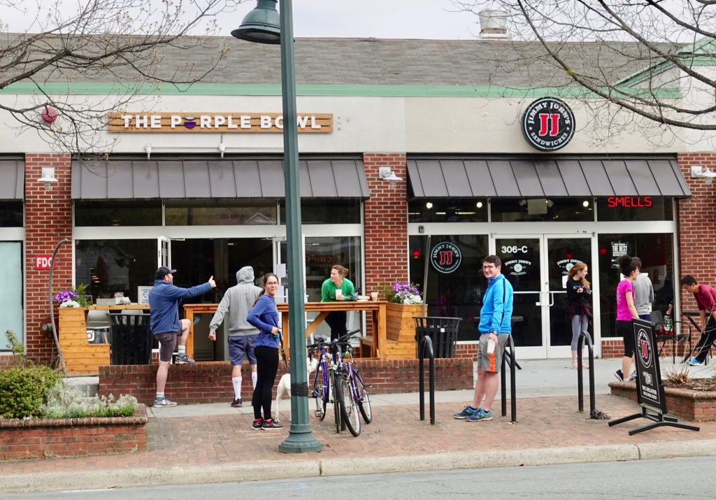 To get to a starting point I drove our car with the bicycle in the back. When in my car at a stoplight in downtown Chapel Hill I saw these people trying to keep a social distance at the Purple Bowl, which serves açaí bowls.
