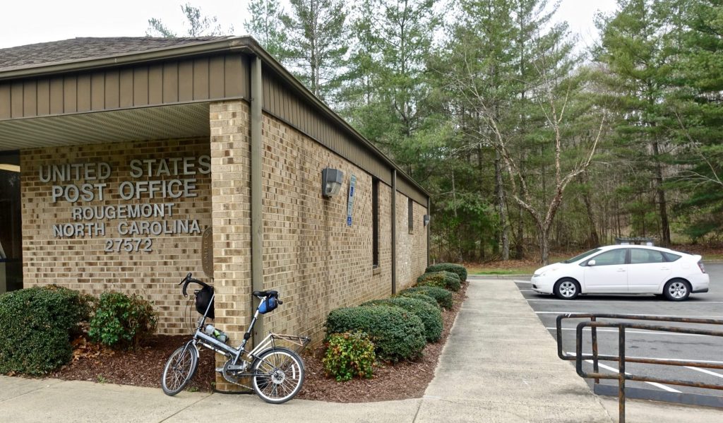 Forty minutes and twenty-eight miles later I parked the Prius at my starting point: the post office on the highway for Rougemont NC; about fifteen miles north of Durham.