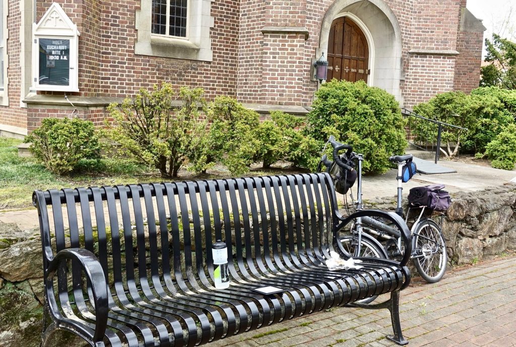 It was time for lunch. There were a few people on the street but no one stopped to talk, which was fine with me. I found a bench in front of the Episcopal church. I could eat my sandwich and read my Kindle.