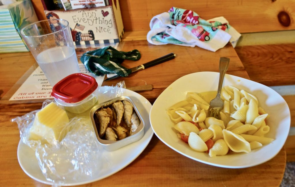 These were my groceries before leaving home in Chapel Hill, stuff I already had in my pantry. I packed it all onto the back of my bicycle. 1/4 of a bag of Pisgsah Crunch mixed nuts trail mix, 1/4 of a box of pasta, the most expensive sardines I could find, one peanut butter sandwich for lunch, one piece of local Eco Farms squash, one unshucked ear of corn, 1/2 cup of plain raw oatmeal for breakfast, one chunk cheddar cheese, 1/4 of a box of local cherry tomatoes, Tupperware containers of olive oil and salt. One lime.