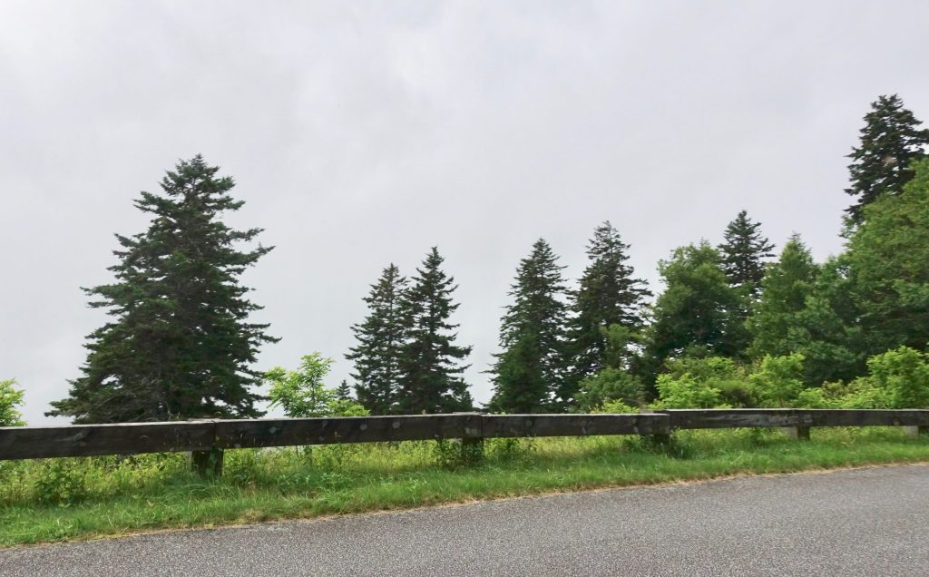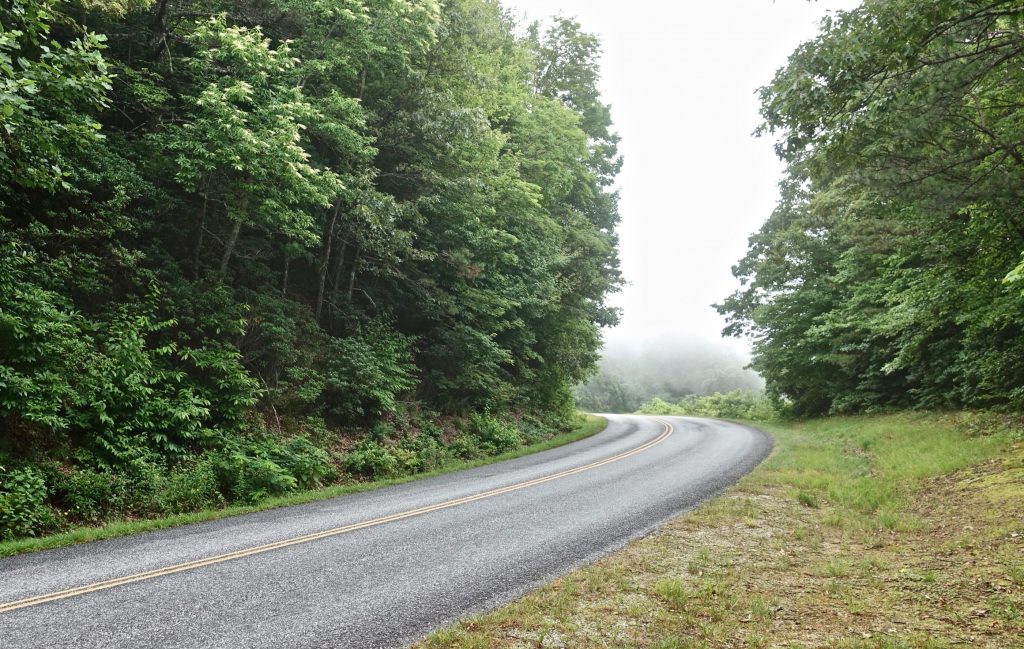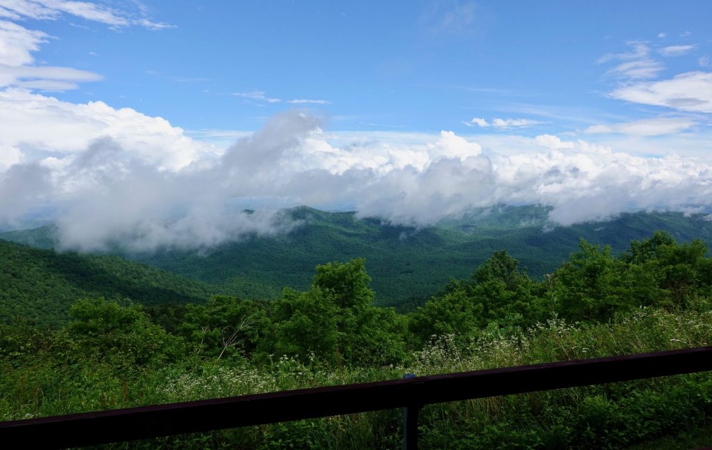 As a covid-19 mitigation effort Lyman and I decided it would not be that difficult for us to stay socially distant from each other for the entire trip. We bicycled out into Asheville suburbia. The Parkway was about three miles away. Once on the Parkway it was up and down for about four miles. After crossing the French Broad River the Parkway started climbing seriously. It was an overcast day. Pretty quickly it felt like we were lifting up into the clouds.
