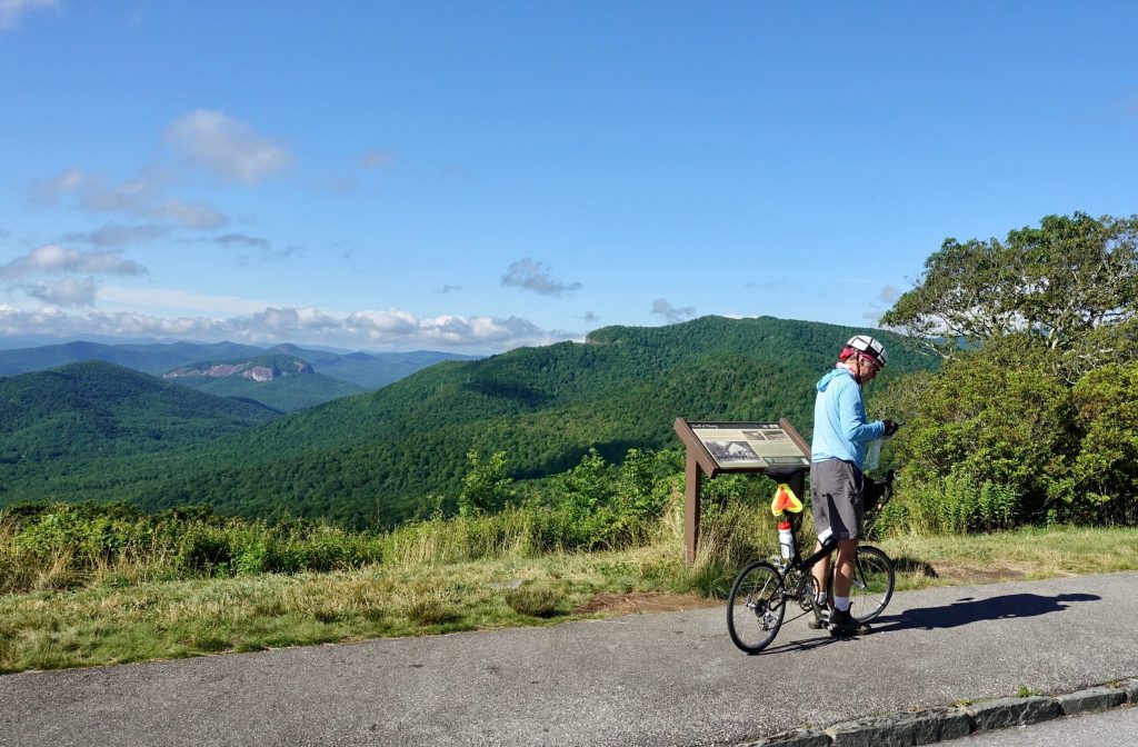 Like everything else in the pandemic, this trip was put together at the last minute. My frequent riding partner Lyman lives in Austin TX. We wanted to get together to bicycle on the Blue Ridge Parkway. A friend of his suddenly had a family emergency in Hendersonville NC and the friend decided to drive the 1,100 miles from Austin TX. Who wants to fly anymore? Lyman caught a ride for himself and his folding bicycle. The guy let Lyman off early in the evening at a cheap motel on the fringes of Asheville NC. The following morning I drove the four hours from Chapel Hill NC to Asheville. We used the motel parking lot as a starting point for a three day bike ride on the Blue Ridge Parkway. I parked my car and pulled my bicycle out of the back. Lyman circled around on his Bike Friday.