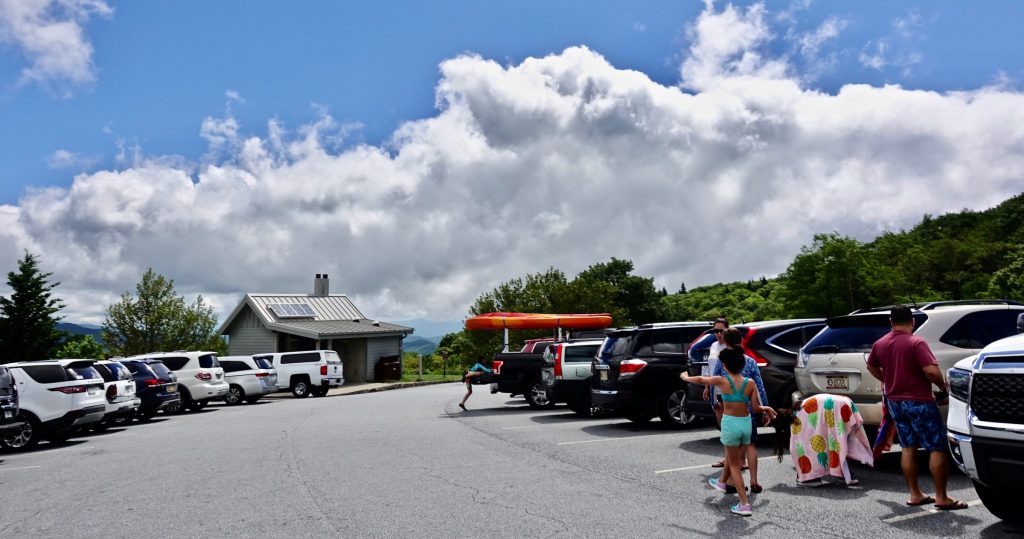 There are picnic areas along the Parkway and we stopped at one to have our lunch. Hardly anyone was around. Later we passed an overlook where cars park for the quarter mile walk to a popular waterfall, the Skinny Dip Falls. It was startling to see so many people.