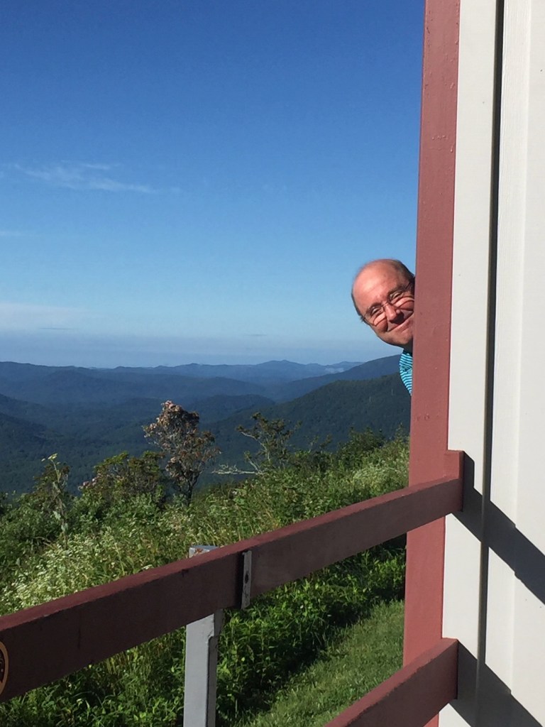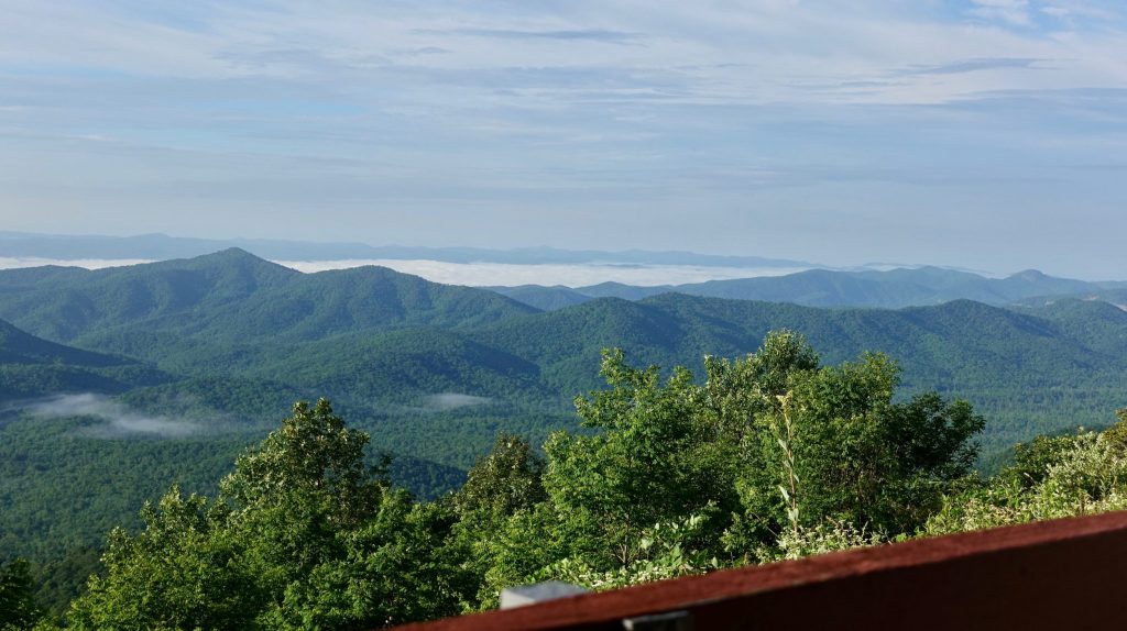 Elsewhere in North Carolina it was a punishingly hot summer day. Here at five thousand feet it was pleasantly chilly and drizzly. Comfort food like homemade chicken pot pie and red wine really hit the spot. We ate on Lyman’s balcony, outdoors and socially distant. Delightful.