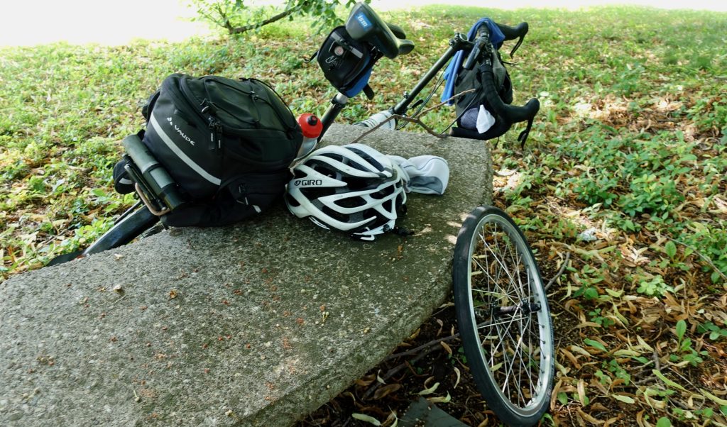 I chilled for a while in the park but eventually got back on the bicycle for the final stretch into Buffalo. After a few miles I rumbled to a stop with a flat tire. There was a bench on the edge of someone’s yard next to the highway where I could sit in the shade while I pulled off the wheel and patched the tube.