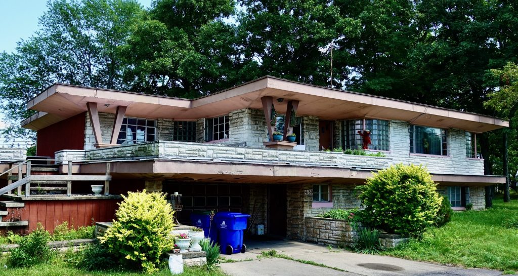 I bicycled by the entrance to a large house designed by Frank Lloyd Wright that is usually open to the public but was closed due to the pandemic. A fence and hedges blocked the view. Here is a photo taken from the internet.