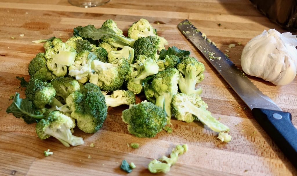 I made this up as I went along. I first cut the stem off the broccoli and cut each floret into bite sized pieces.