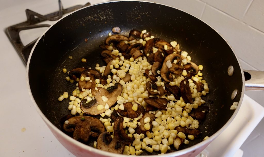 After the mushrooms had reduced by half I cut the corn off the cob and added this to the mushrooms.