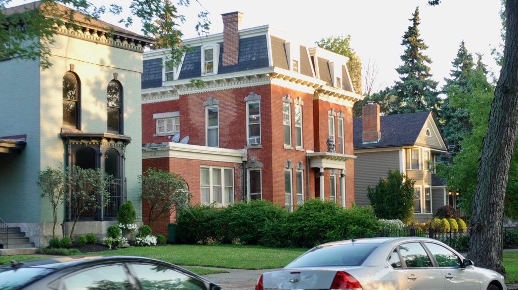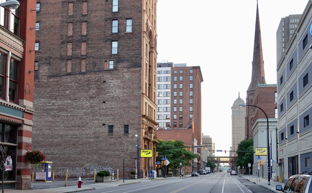 The next morning I had a plan. It would start with a fifteen mile bike ride, from my Airbnb to downtown Buffalo, then through Buffalo’s trendier districts in the north of the city, before turning east and cycling to the Buffalo/Niagara airport, where I had reserved an Enterprise Rentacar. I would drive the car two hours back to an Enterprise office in Warren PA, drop the car off and then cycle the two miles back to my Prius that I had left at the Warren Walmart. I would then put the bicycle in the car and drive home ten hours to North Carolina. It was a lot to do. I had to start early. (I always wake up early anyway!) I bicycled out onto the street in South Buffalo at 6:15 AM. It was a lovely cool morning.