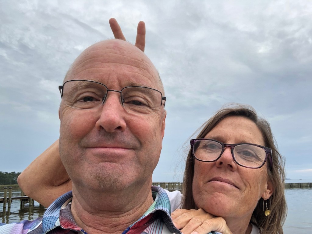 It was beautiful and silent. Most of the trail is a gravel path a few hundred yards inland from the beach, on a barrier island about a quarter of a mile wide. We saw only two or three other people the whole time we were in the state park. We were just single digits in miles from the North Carolina line but darkness was approaching. We turned around and bicycled back to our car. In the car it was a forty minute drive to my late mother’s house in Virginia Beach where we had a delicious dinner.