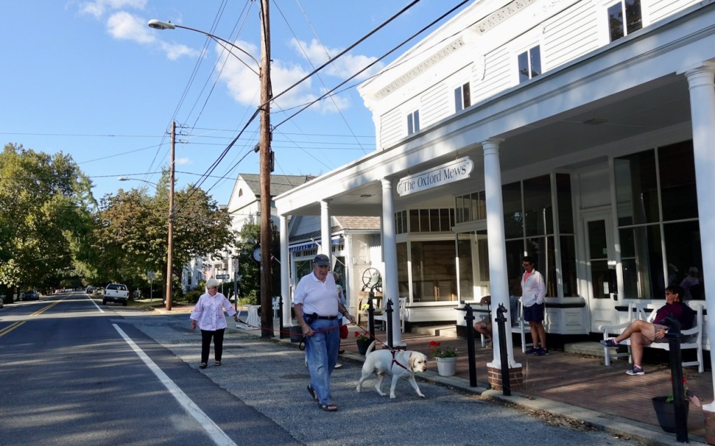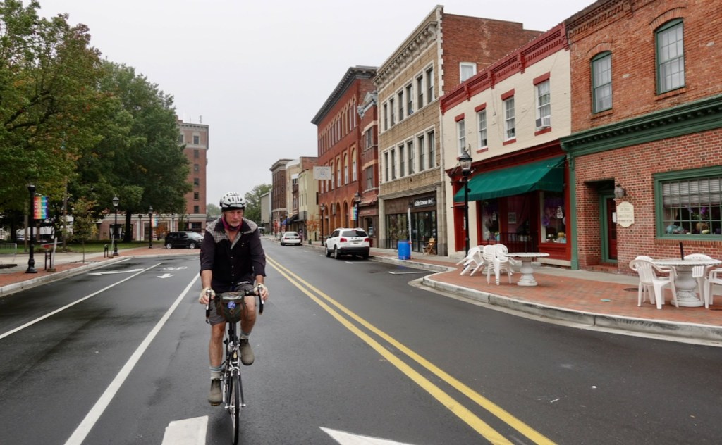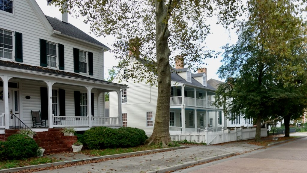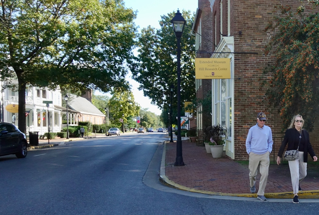 Just off the highway on the edge of Easton MD in early afternoon I parked the car at the Quality Inn. We decided to take an afternoon bike ride, first through Easton then out to two towns I had heard were picturesque before returning to the motel. As you can see from the maps above, the western (left) side on the Eastern Shore peninsula is lined with “rivers” which are actually estuaries of brackish water. In the 1700’s ocean going vessels could tie up directly at towns like Easton, St. Michaels, and Oxford. We headed out by bicycle through downtown Easton MD (population 16,000) Downtown Easton looks like what I imagine an English country town would look like.
