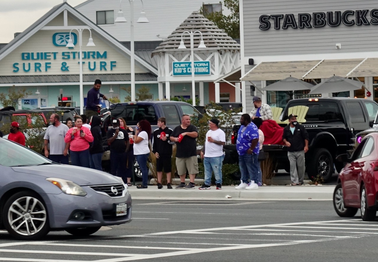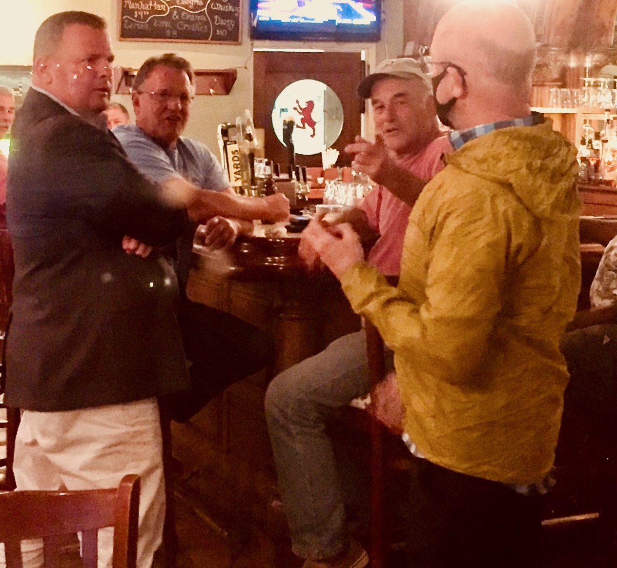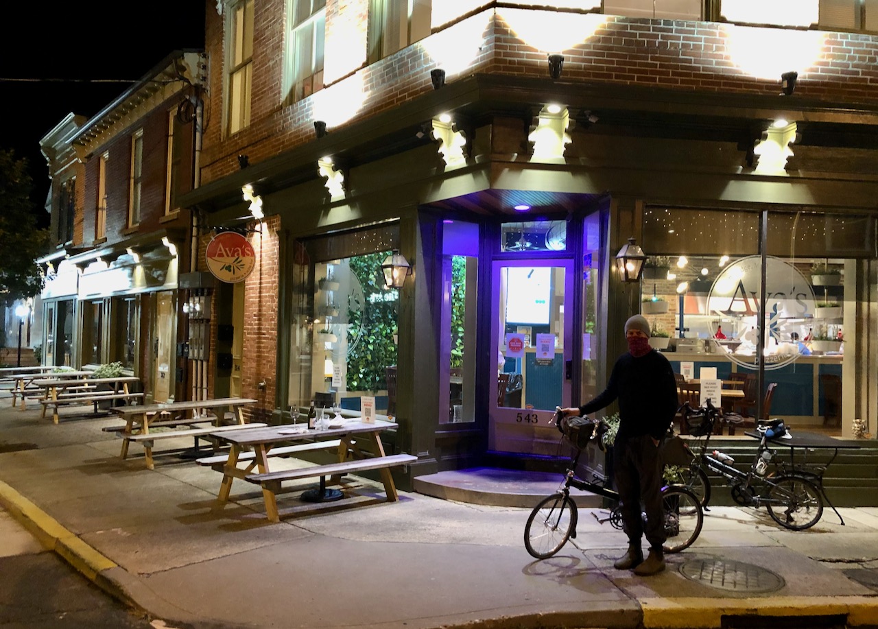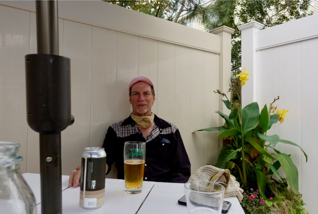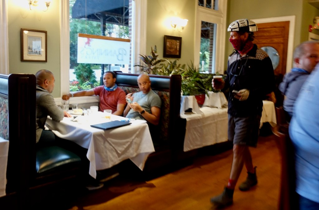 It was late in the afternoon when we left to bicycle the eleven miles back to Easton MD. We arrived back in downtown Easton just as it was getting dark. We decided we would have a beer. We had no interest in hanging in any enclosed space like a bar. Outside one place was an empty outdoor table and we walked (masked) inside to get a beer. Several guys at the bar were not practicing social distancing. We got our beers and walked outside.