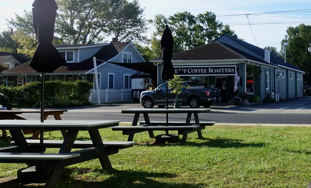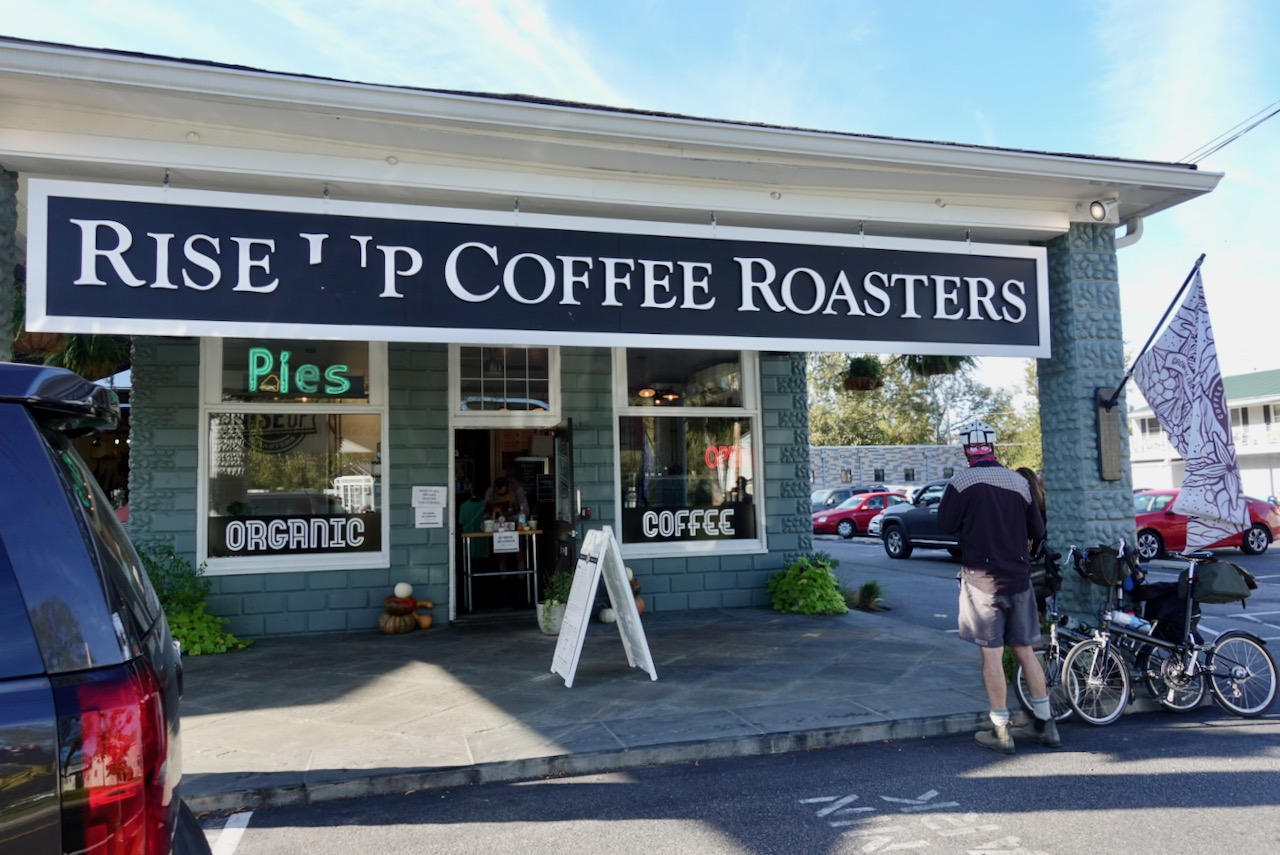 The next morning we cycled about one mile back into Easton and to an independent coffee place. They had outdoor tables. The weather was perfect, it was going to be a nice day.