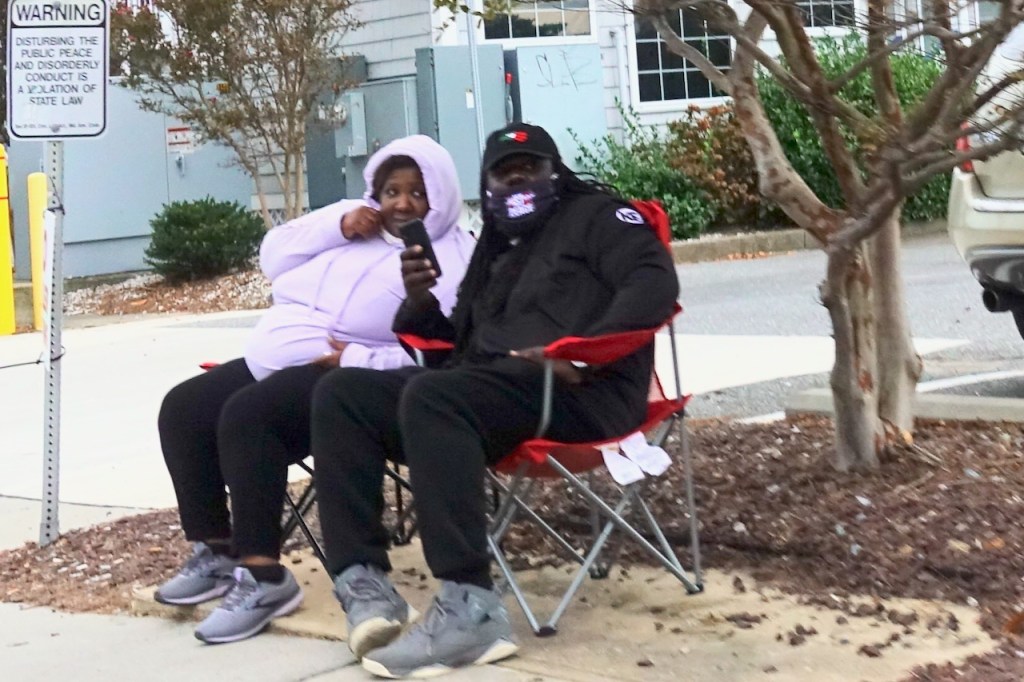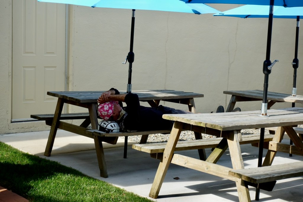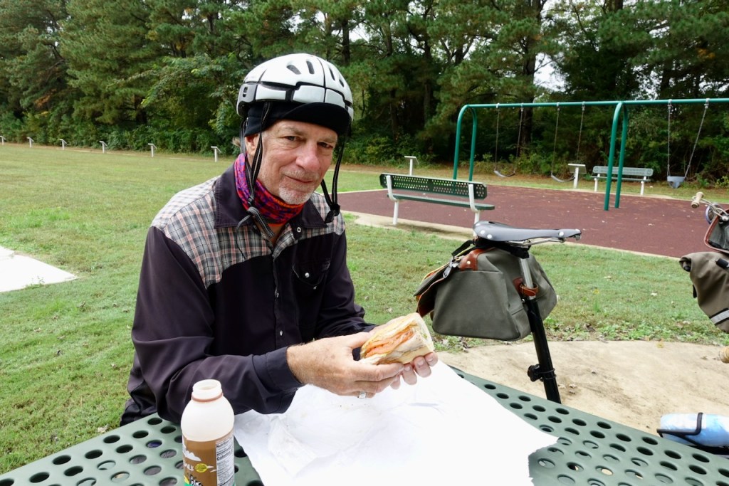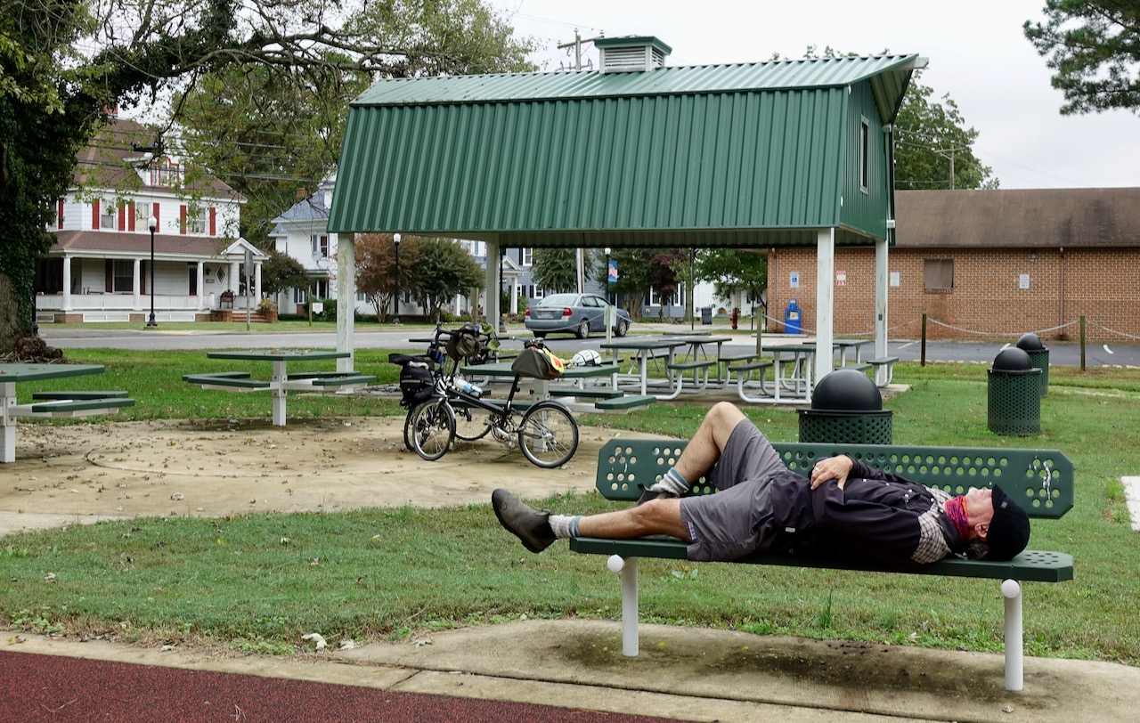Twenty something miles further we stopped for lunch in the larger town of Georgetown DE (population 6,500.) We looked for a place to get lunch and still feel safe. Because of the pandemic the options in downtown Georgetown were not great, several restaurants were closed. The town has done its part to help downtown restaurants by setting up outdoor seating areas but they looked unused. Low and behold we found a taco truck! Actually a Mexican (or Central American?) food truck specializing in pupusas. We realized pretty quickly that there is a large Spanish speaking population in Georgetown. Waiting in line with us at the taco truck were two guys in FM radio promotional outfits. As they bought tacos they tried to sell the taco truck guy on the virtues of radio advertising. We took the tacos and pupusas back a few blocks to the town’s public tables. Afterward Lyman took his usual twenty minute nap while I plotted our next move.