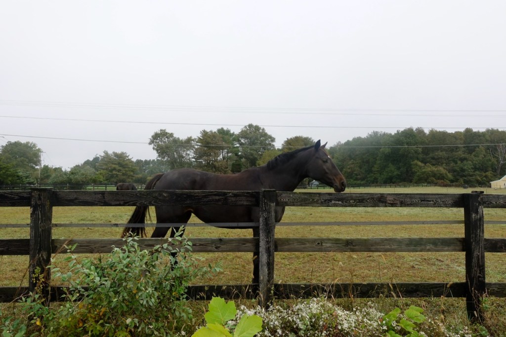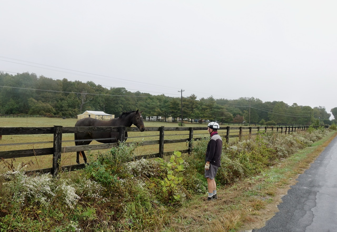 It was not a hard rain and we soldiered on. In the middle of nowhere we stopped to look at the map on our phones and this horse wandered over to say hello.
