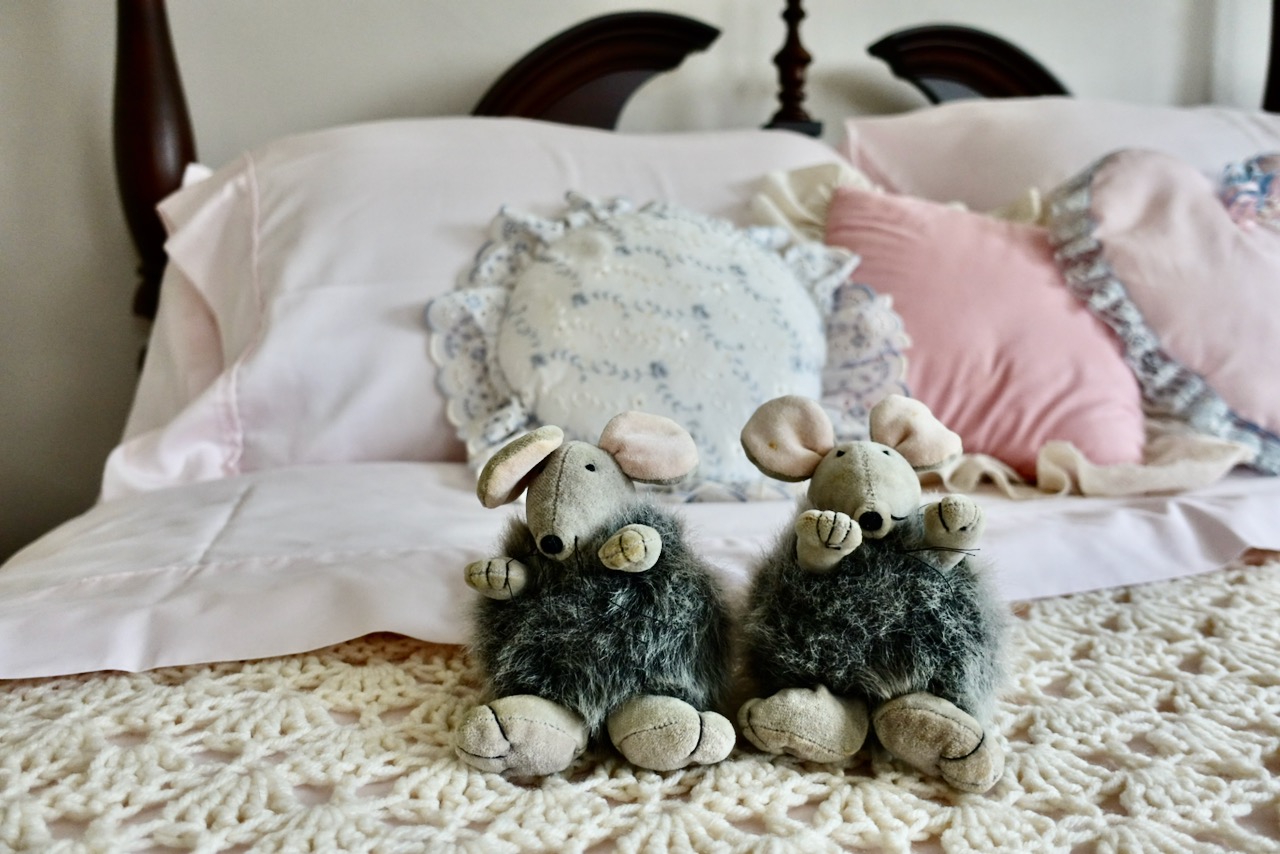 She had gone to a lot of trouble to make the place “nice.” The bed was indeed very comfortable and the towels fluffy. There were lots of extraneous decorations. Cute stuff. These two mice that were greeting me on the bed as I entered the room. Hmmm.