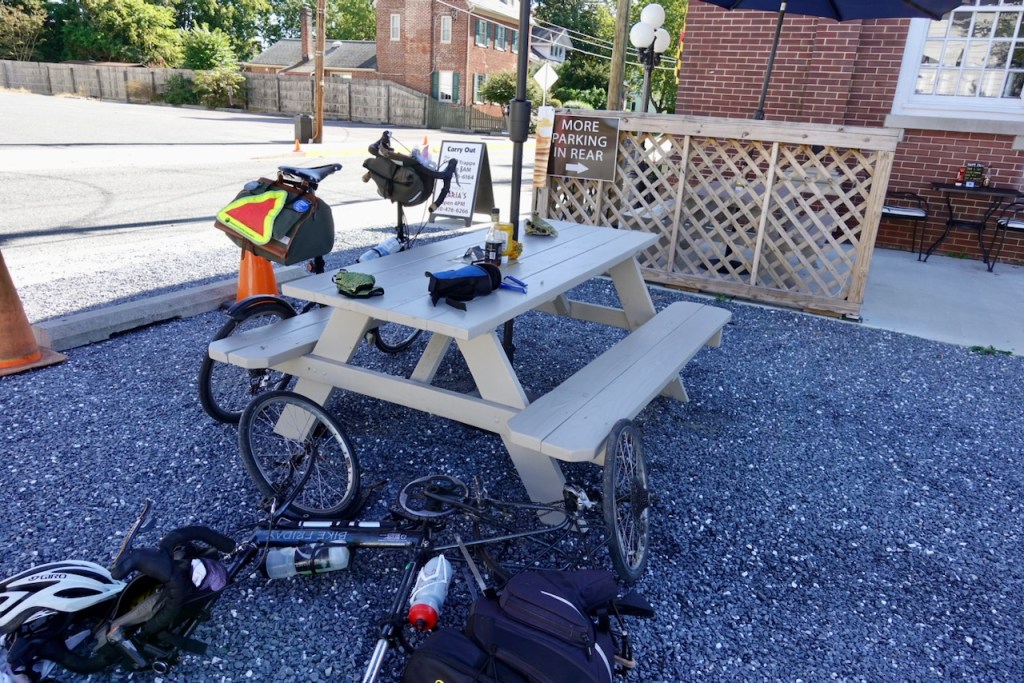 Eating on the road during a bicycle tour during a pandemic is problematic. We did not want to gather indoors but we wanted good food in a restful setting (I take dinner and its setting very seriously!) This first night we had the advantage of a car. We used that car to drive two miles to an African-American owned barbecue place. We got takeout. Maryland is not as dogmatic as North Carolina about barbecue; there were a variety of cooked meats. (North Carolina barbecue is strictly only pork!) We both ordered variations of beef brisket and took the dinners back to the motel. We ate outdoors at chairs that sat out front, probably put there for smokers. The space was actually was quite nice and the barbecue was delicious.