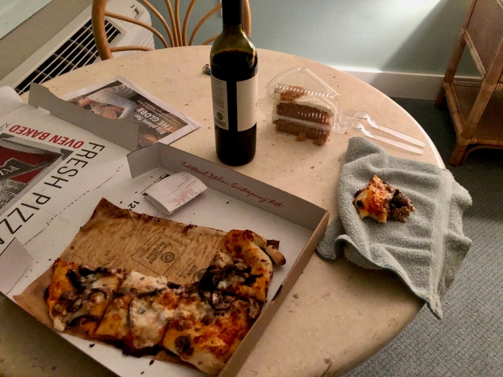 Later we walked back to downtown and found an Italian place, the kind that serves wood fired pizzas that serve 1 – 2. With the pizza they sold us a bottle of wine and a slice of carrot cake. We took it all back to Lyman’s room and sat outdoors six feet apart on his balcony looking at the night. It was very pleasant.