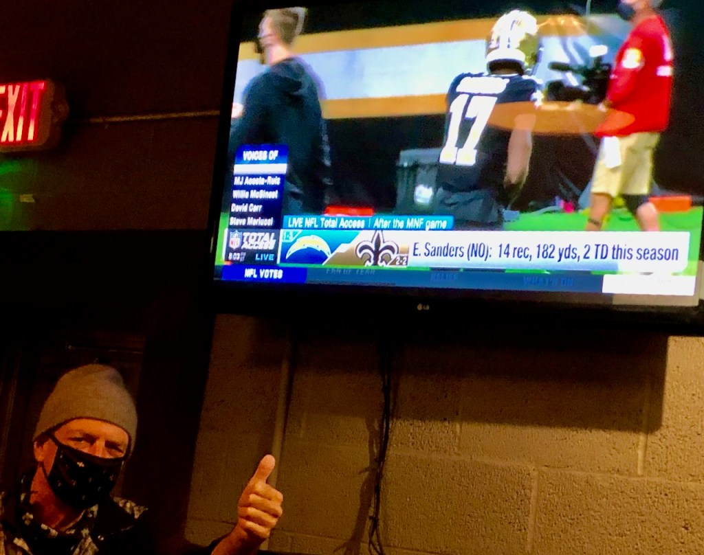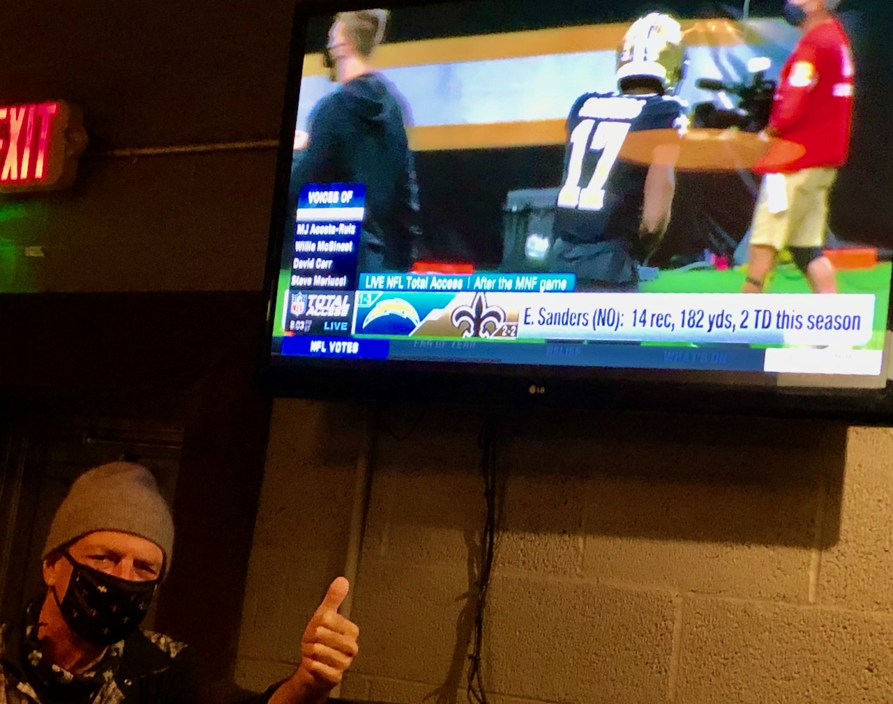 We ate that night at Evolution Craft Brewing, walking distance to our hotel. The drizzly rain continued and their outdoor seating was not covered. The restaurant/brewery was largely empty, a former warehouse with high ceilings and large distances between tables. For the only time on this trip, we ate inside. (I felt guilty about it!). After dinner Lyman and I cheered on the New Orleans Saints. Lyman is part of a group of Austin TX Saints fans that watch every game together. (Lyman is originally from New Orleans.) Tootie and I lived in New Orleans 1981-88 and remain Saints fans as well.